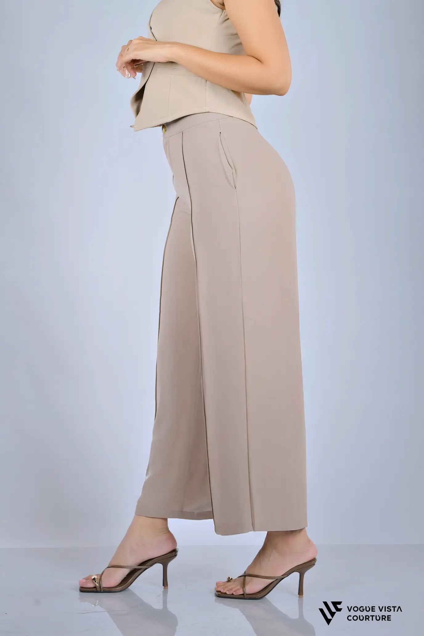 Sophisticated wide-leg trousers crafted with strategic vertical paneling to create a refined, lengthening silhouette. The structured design delivers polished versatility, making these pants an essential choice for professional environments where understated elegance matters.
